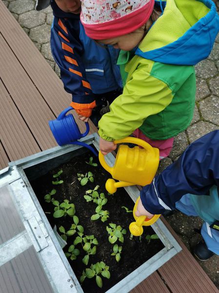 In unserem eigenen Hochbeet pflanzen und ernten wir unser Gemüse und Obst.